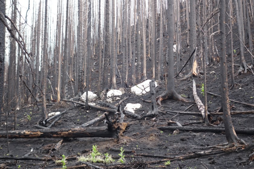 Initially we walked along old 4 wheel drive roads. We ascended over some blowdowns (trees that have fallen down across the trail). The day saw us walk in environments ranging from open, recovering burn ares, to thick forests.