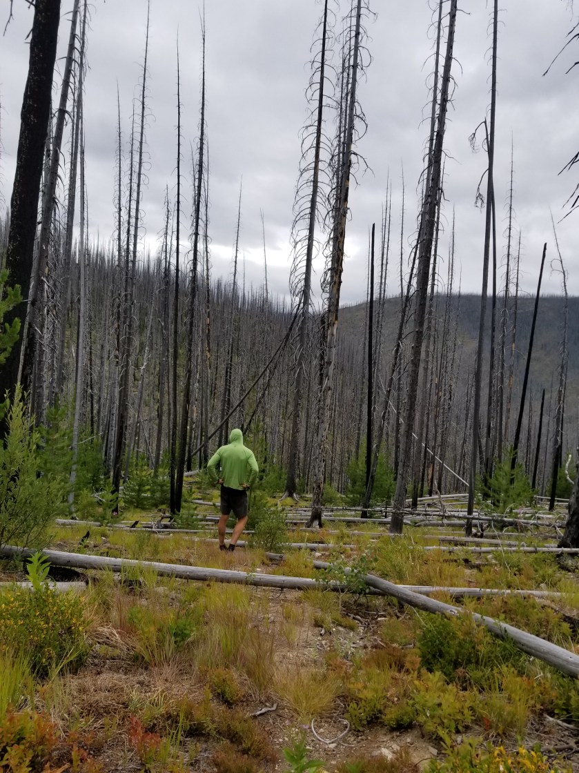 In the morning, I was keen to get moving. Although I love being up high in open meadows, sometimes a lightly traveled trail like the PNT gets swallowed up by the robust meadow plants. I followed cairns for awhile, and then the trail entered a different burn area. This area was a lodge pole forest that had burned 15 years or so ago. Every year, more 40 foot tall skeletons of trees would topple over like the children’s game of pick up sticks.
