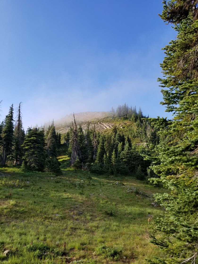 In the morning I heard a couple more deer make their way across the pass while I tried to wake up. I was in a cloud. Literally. The cloud cover had dropped. However, it quickly lifted while I was packing, even showing hints of blue in the west.