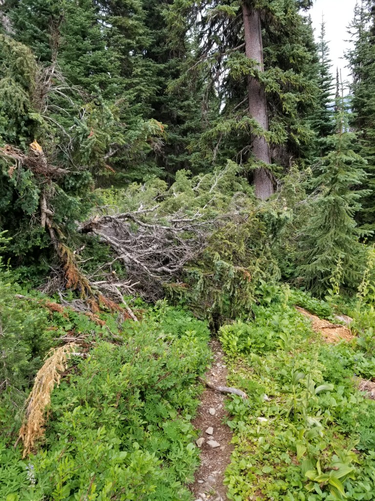Around 4:00, I heard distant thunder. Within a half hour, I could see flashes and heard thunder nearby. This was bad given how dry the forests were. I was now going to just go over Sky Pilot Pass and camp early.