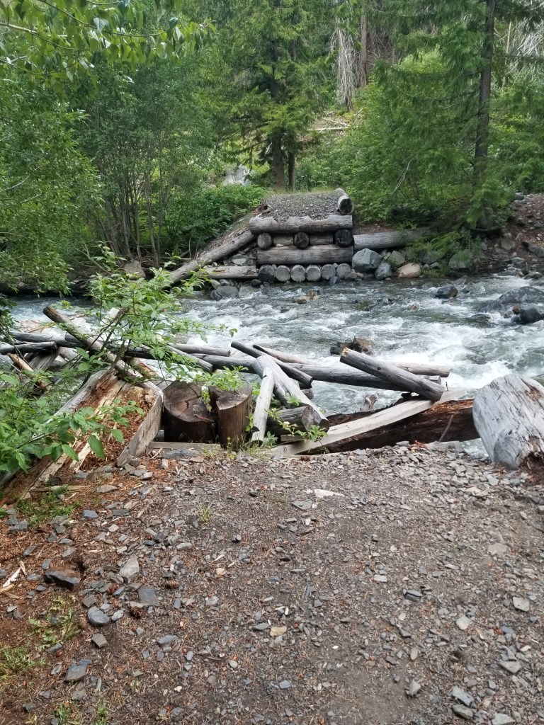 I had researched this little used access trail. It was a known problem that about 2 miles in a bridge was destroyed, requiring a ford. Also, there were notations about the trail being “impassable” to stock. The area had burned about 15 years ago. Standing burned trees topple over, like sticks, so it was not surprising to see the description.