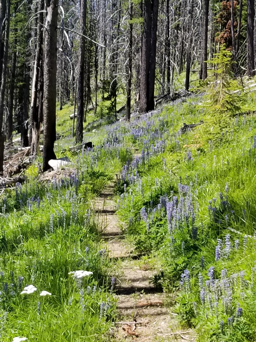 Having reached the peak height for the day, I crossed a meadow that would lead to several hours in a burn area.