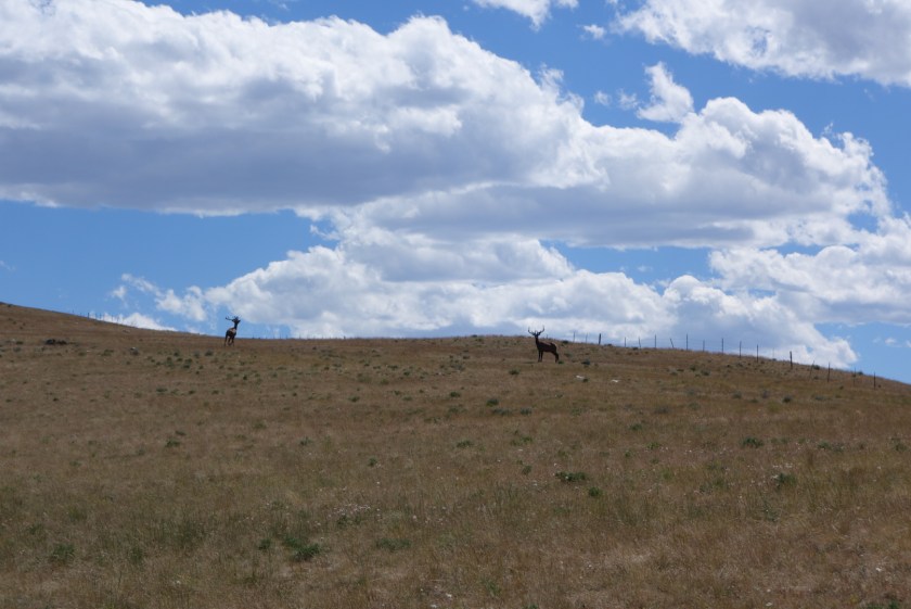 No Internet or cell signal. I started to update blog posts since I would soon be near power. However, in the warm morning sun, I dozed off. I awoke to a large bull elk moving rapidly uphill through the cattle field. The steers were making noise, but it was unclear whether they were cheers or jeers as the elk easily jumped the barbed wire fence forming the prison around the cattle.
