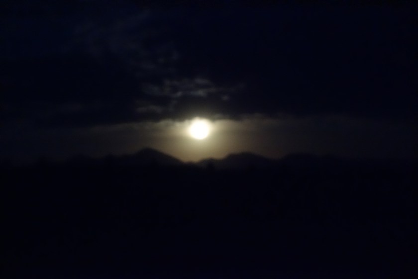 There were about 10 minutes of post-sunset light left and a slight breeze from the west. It would be dark for about 2 hours before the full moon rose. I was putting away my maps, pleased with a short three miles tomorrow before a ride in to town.