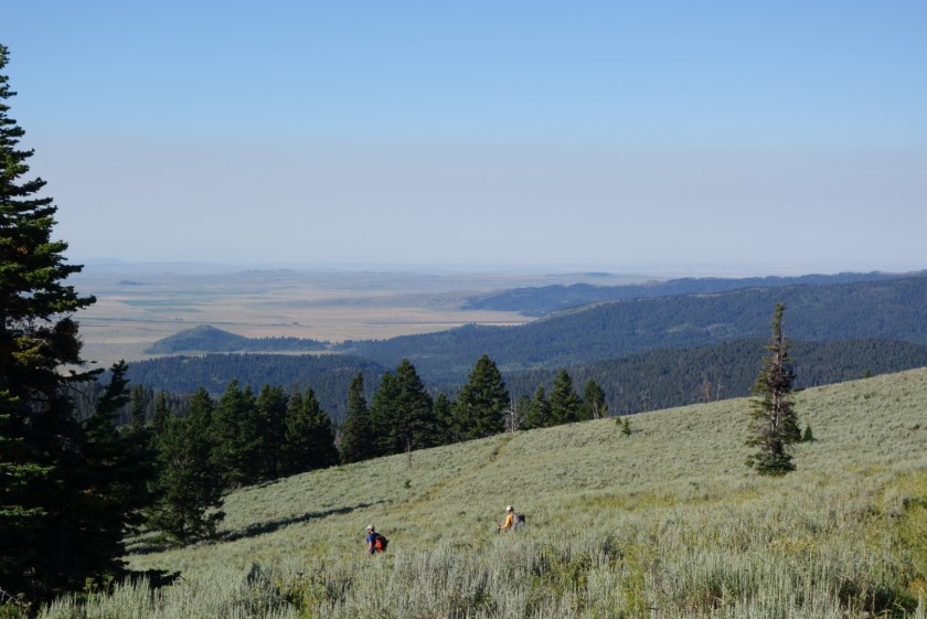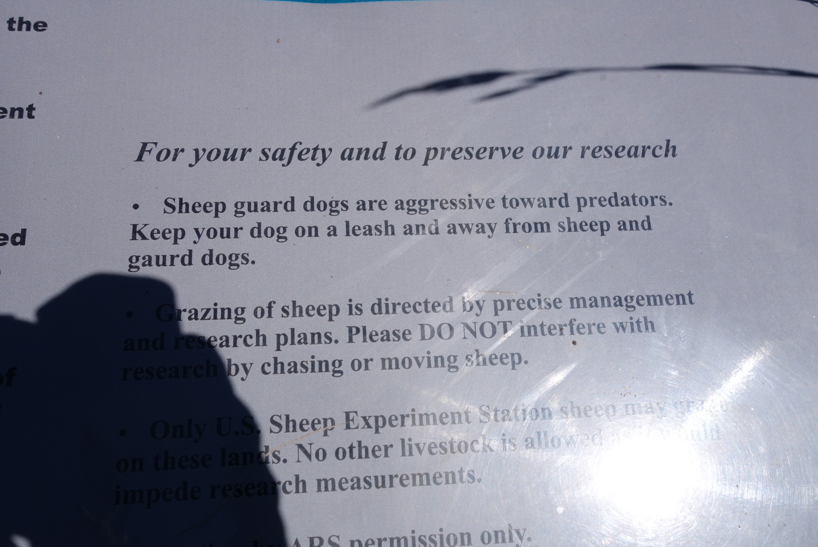 We had been going in and out of the US Department of Agriculture Experimental Sheep Station. There was a sign explaining roughly what was going on. It is intending to improve the stock and also see what plants the sheep eat. During the two day walk through the area, it seemed to me the most successful experiment they conducted was to make the sheep invisible. Never saw a one. (Of the several signs explaining Experimental Sheep Station activities, they all misspelled “gaurd dogs.”)