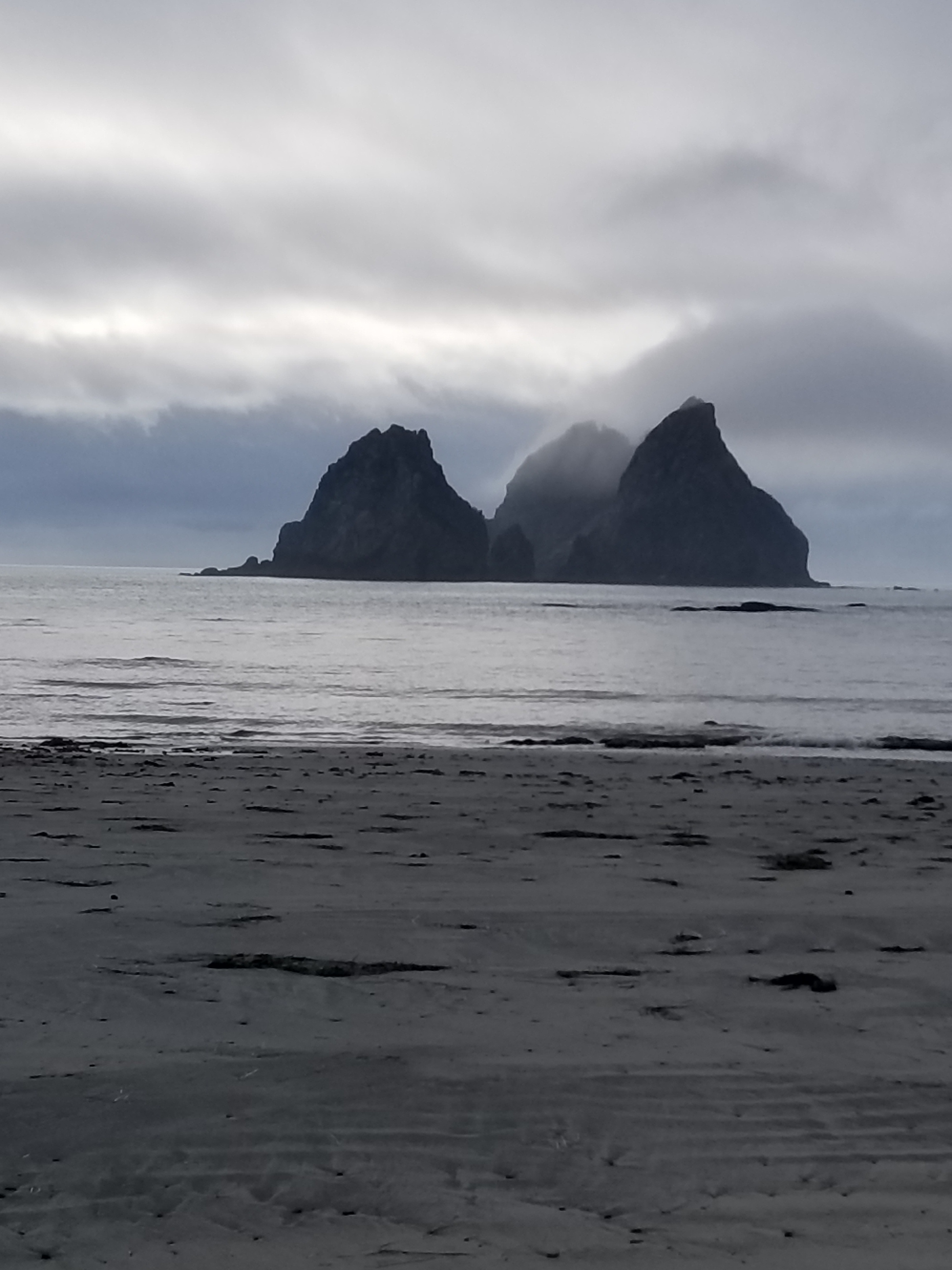 I got up early because low tide was around 7:30. The first part of my morning was easy hiking on firm sand. It was overcast with de minimis drizzle.