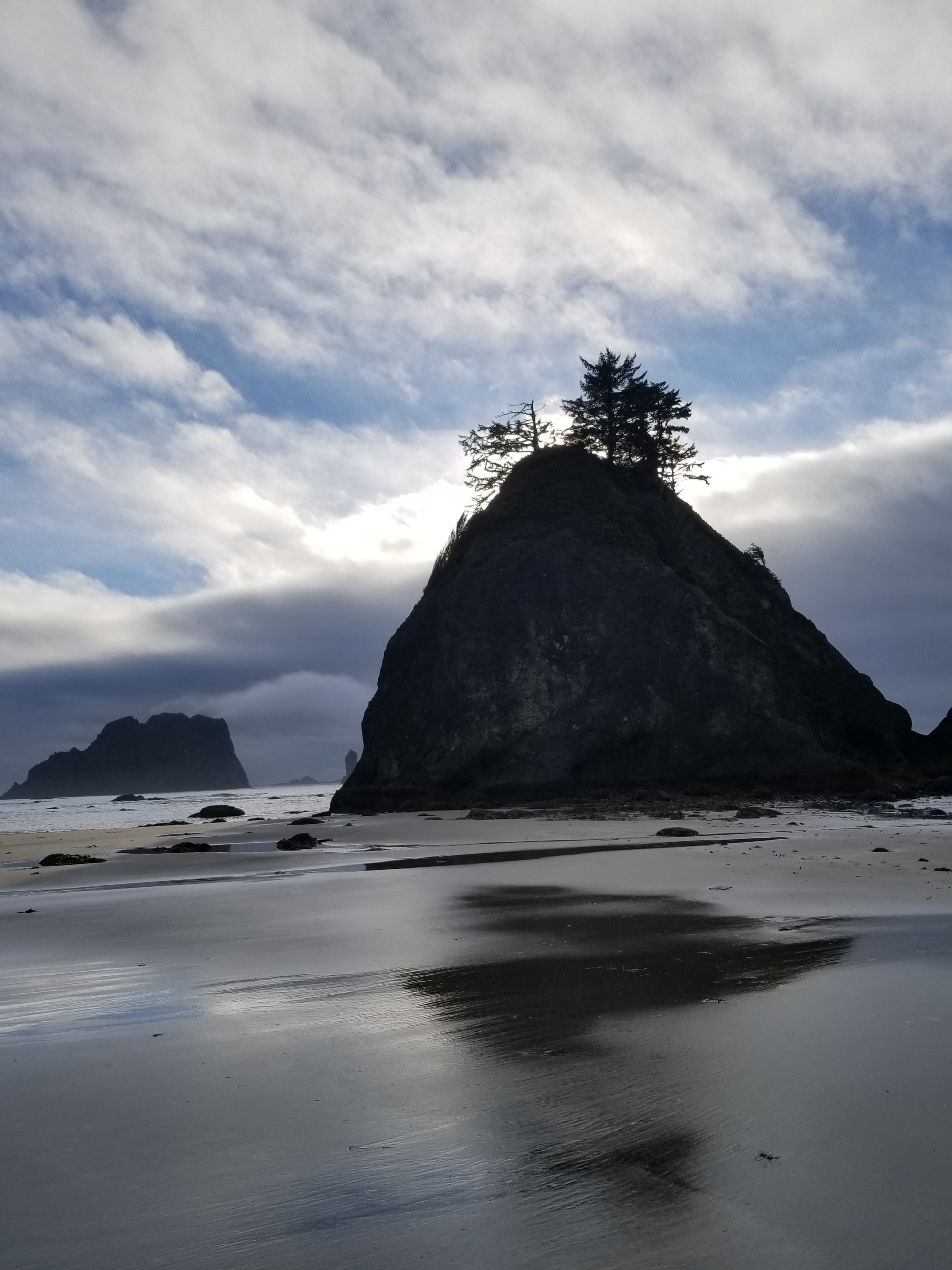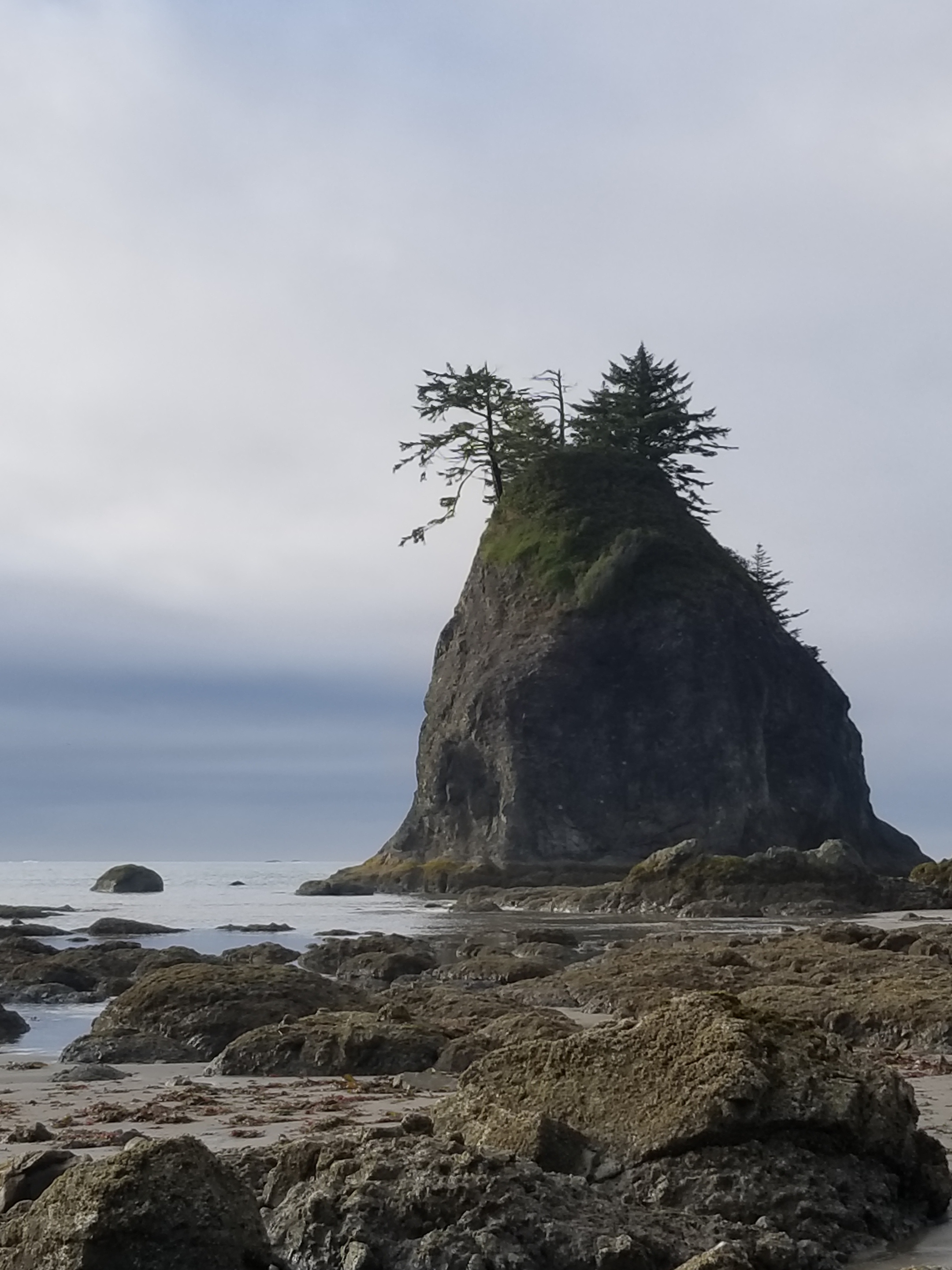 I arrived at Rialto Beach. Despite the drizzle and cold, the parking lot was full. I used the faucet to fill up on fresh water. Like most tourist locations, about 70% of the people stayed within 500 feet of their car, so very quickly I was on uncrowded beach.