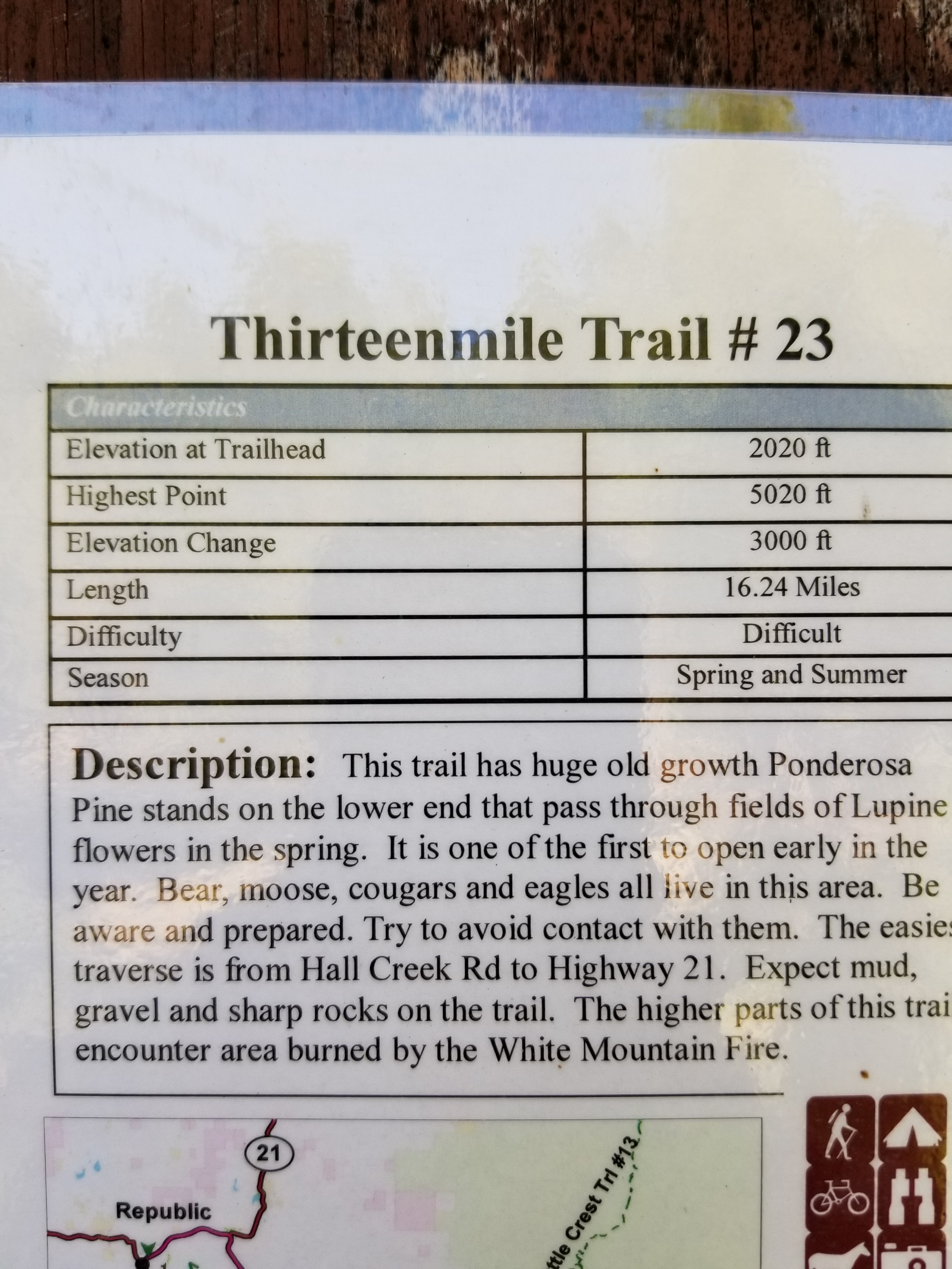 Later, I crossed a road with a trailhead. I loved it. There was a description of Thirteen Mile Trail. Best part? The length of the trail. All of my avid blog followers know I love goofy signs. So, both of them can understand my glee over the Thirteen Mile Trail being 16 miles. What do you think happened?