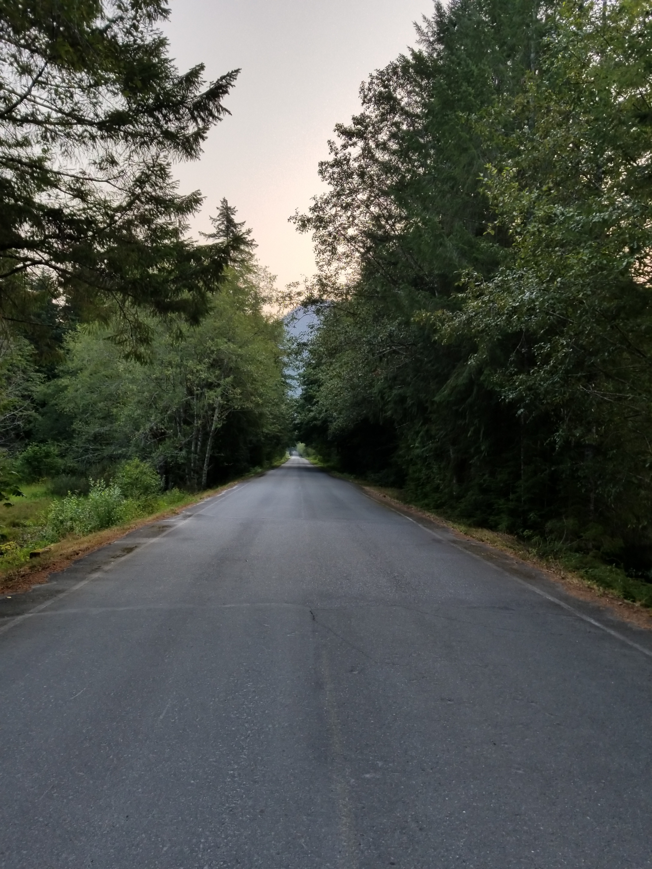 I eventually jumped off the busy Baker Lake Road and went on the shoulder-less Burpee Hill Road. Since all of the motels in Concrete had been sold out for weeks, my plan was to sleep up on the bluff overlooking town and then drop down early in the morning. Hopefully, there would be some public land I could camp on.