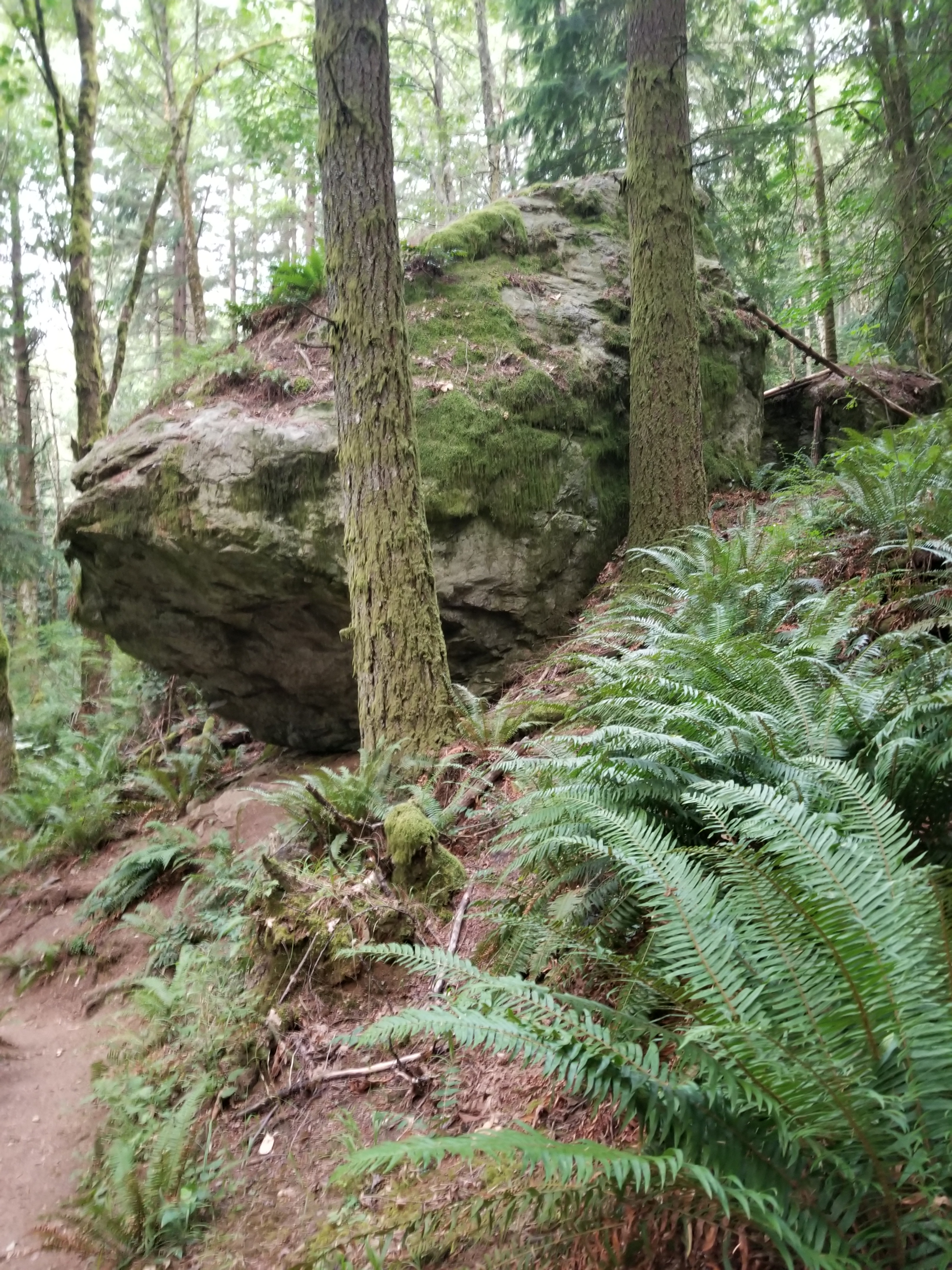 I got my first glimpse of Puget Sound, but a glimpse was all given the haze. This would be a spectacular trail on a clear day. At the bottom of the trail, there was a carved stone marker related to the PNT. All the words were spelled correctly. However, the math did catch my eye, not adding up to even 1,100 miles when the trail today is over 1,200 miles. Must be reroutes and other changes.