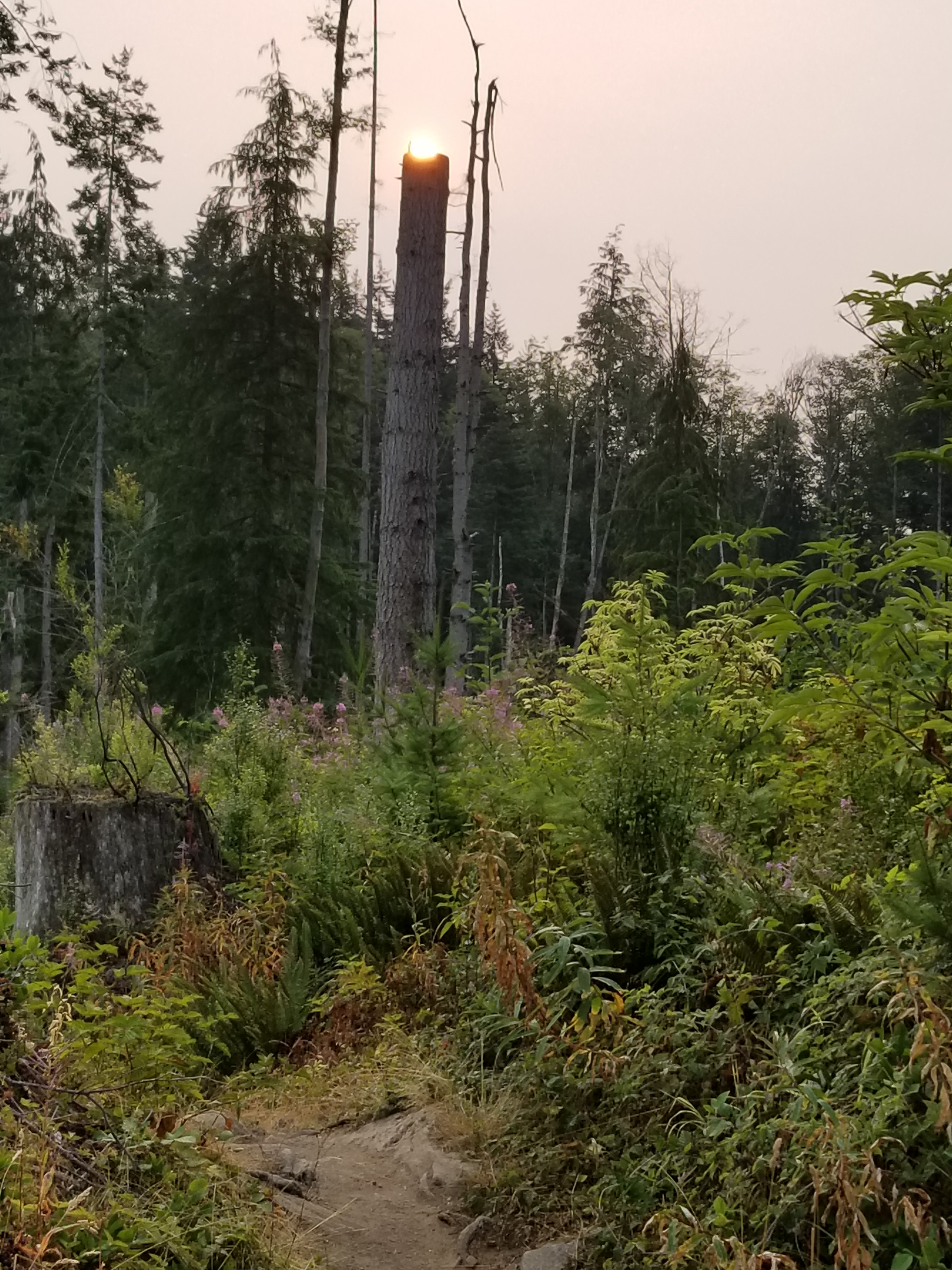 There was a timber harvest going on so there were some temporary trail closures that got me confused at times. Still, I made good time while the sun rose through the smoke filled air.