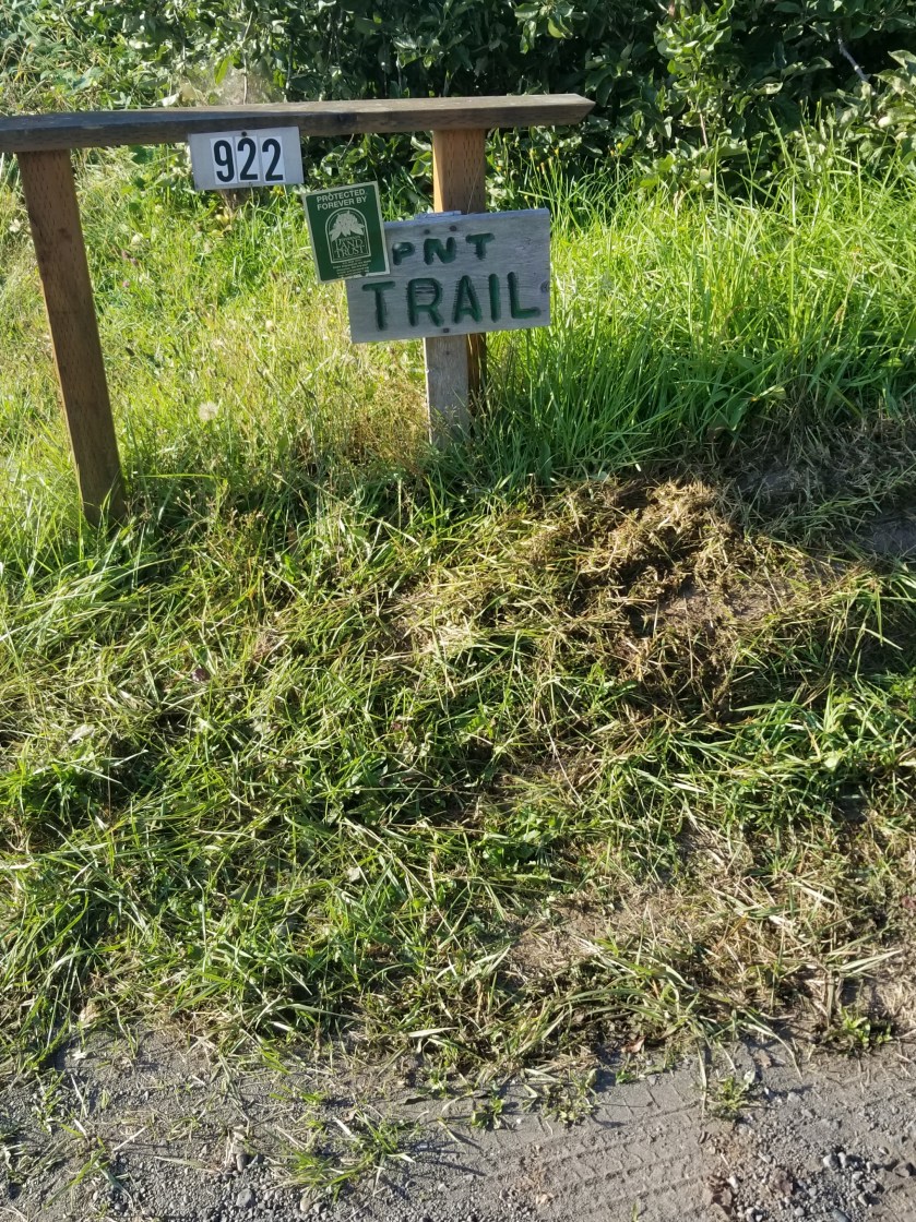 My next challenge was finding the trailhead. The app on my phone said I had passed it. I went back to the driveway of a house and noticed a “PNT Trail” sign attached to their mailbox. However, there were also signs on the driveway saying it was private property and there was “no through traffic.” I walked up the driveway and saw a younger man on the porch. I asked him if this was the way to the PNT. He said he did not know. I asked if it was OK for me to cross the property. He said he wasn’t sure. I was not sure whether he was being difficult or sincere.