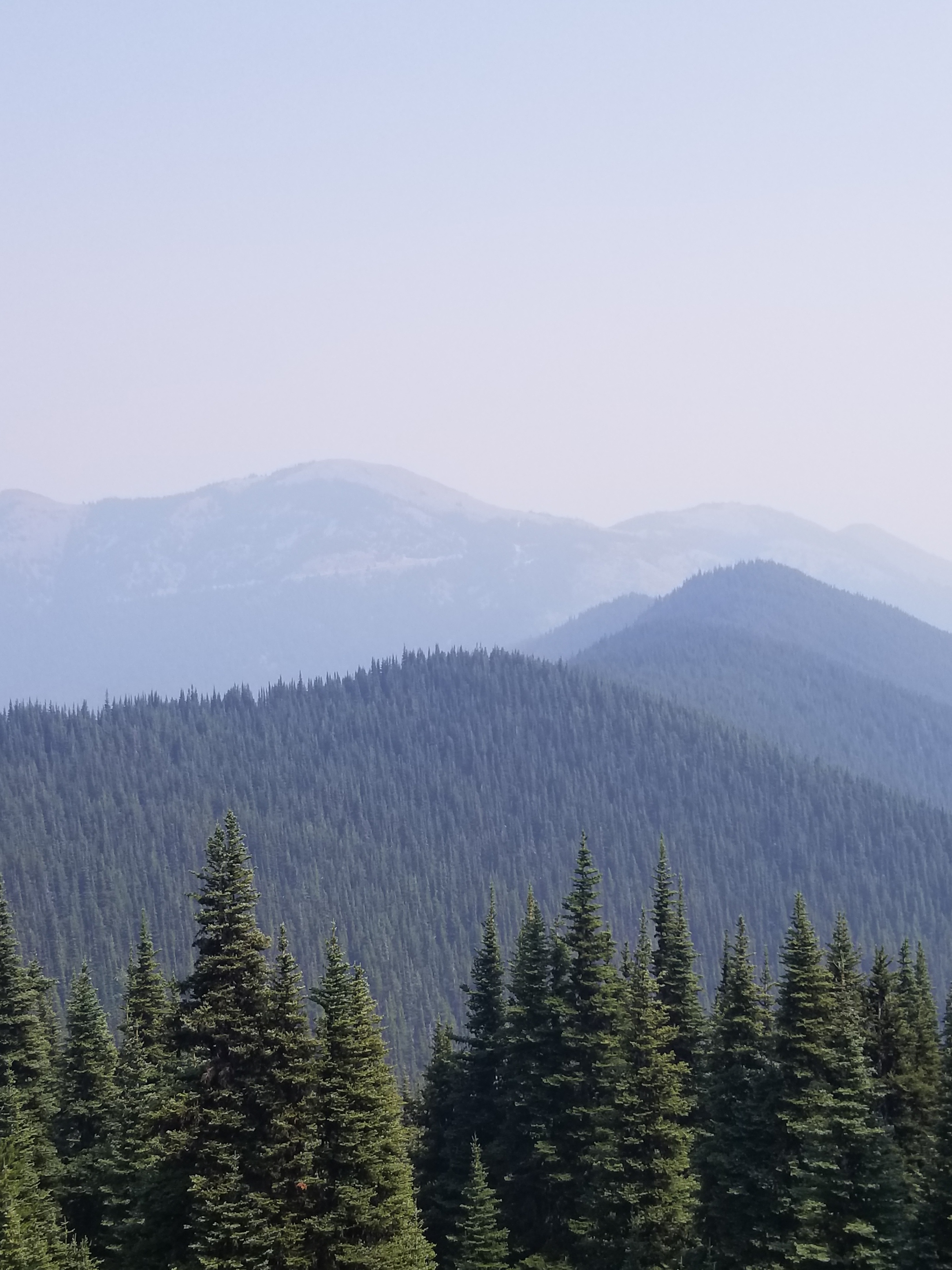 After a few miles, I reached a break in the trees. I was surprised to see that upper level winds had blown away the smoke from some mountain tops given gorgeous views.