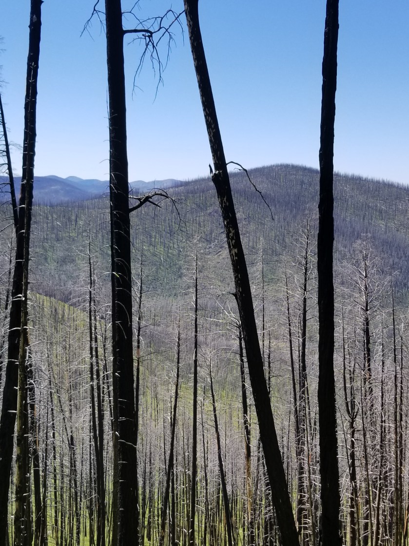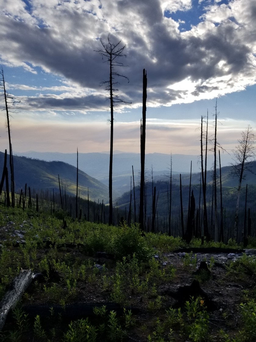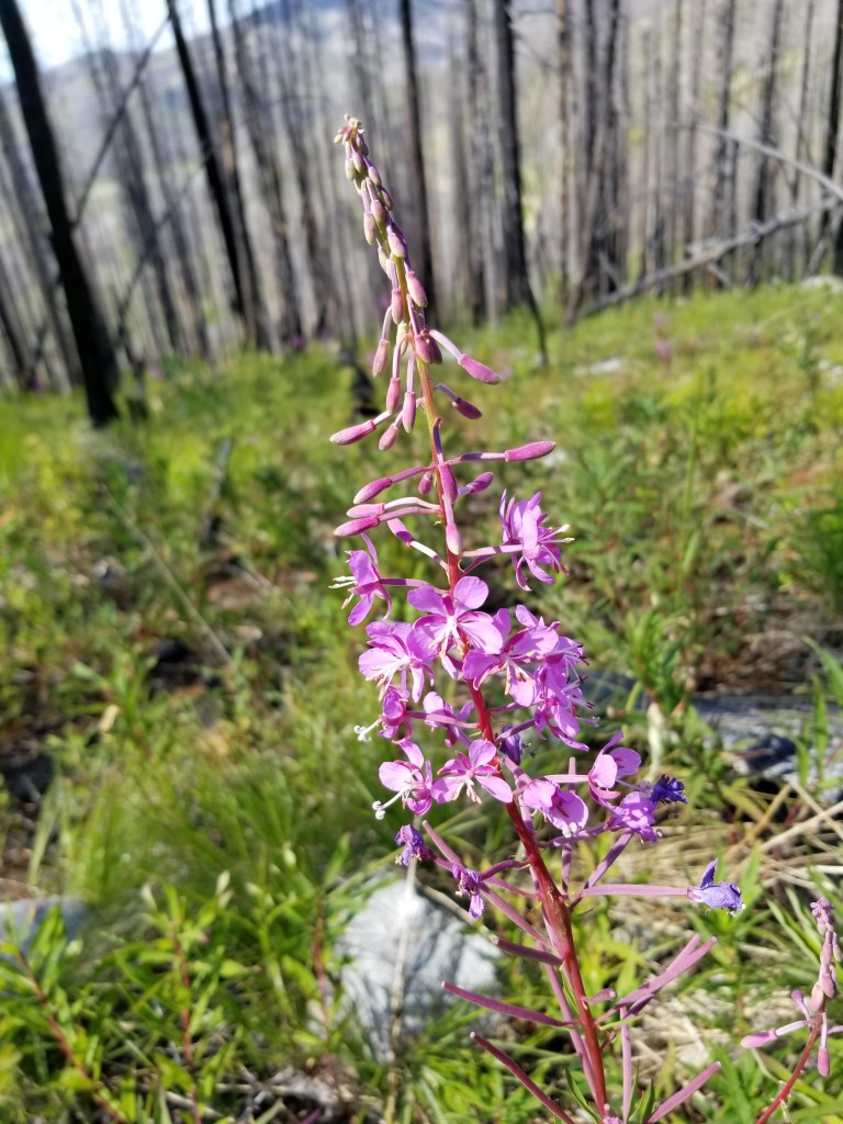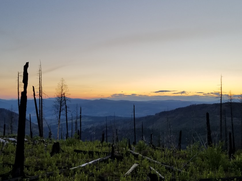 The day changed tremendously when I entered the burn area. In 2015, a massive complex of fires swept over a large swath of this country. I entered an area of standing deadwood, charred fallen logs, fireweed, and lupine. The trail dwindled from a gravel road used to salvage usable burned wood to abandoned forest service roads with multiple blowdowns.