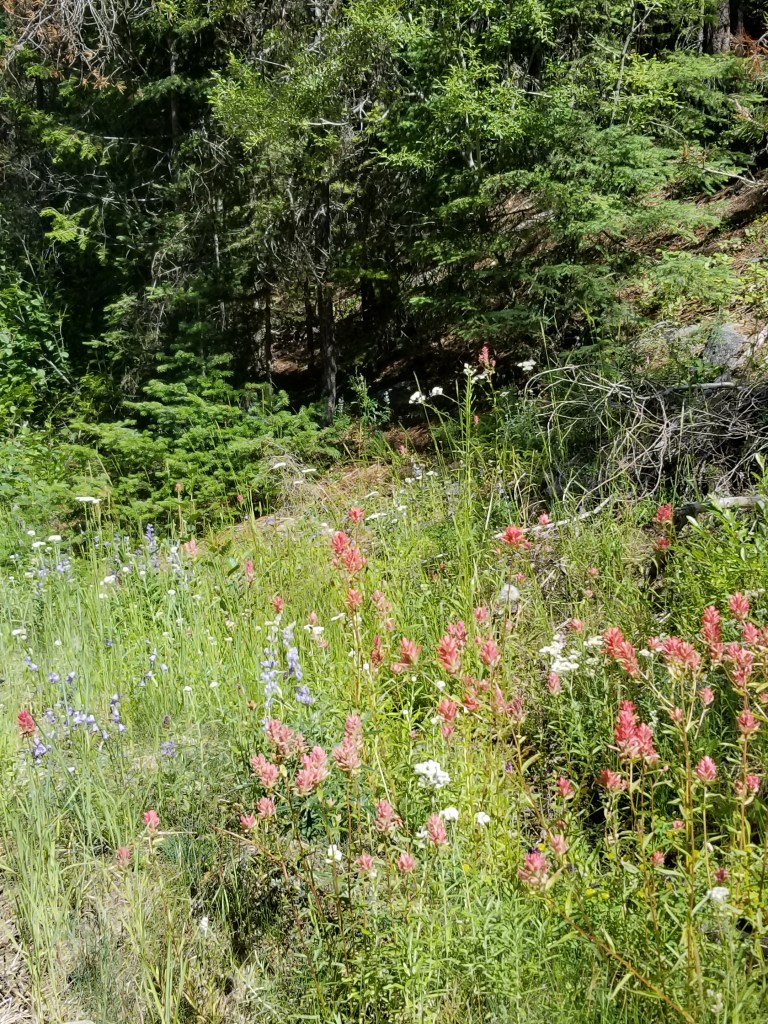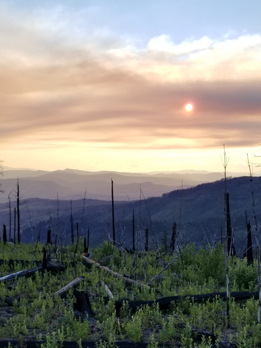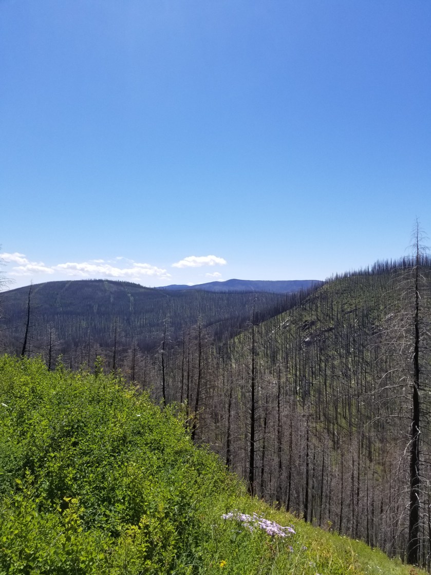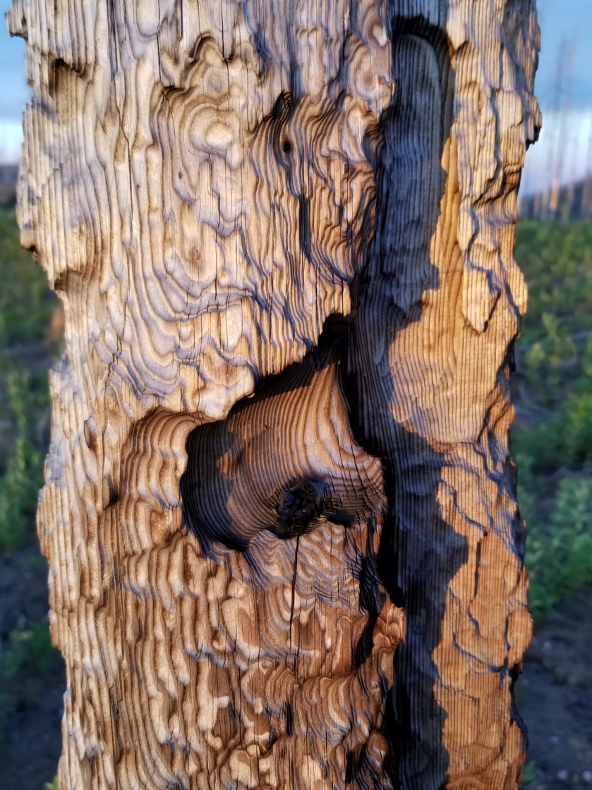 The day changed tremendously when I entered the burn area. In 2015, a massive complex of fires swept over a large swath of this country. I entered an area of standing deadwood, charred fallen logs, fireweed, and lupine. The trail dwindled from a gravel road used to salvage usable burned wood to abandoned forest service roads with multiple blowdowns.
