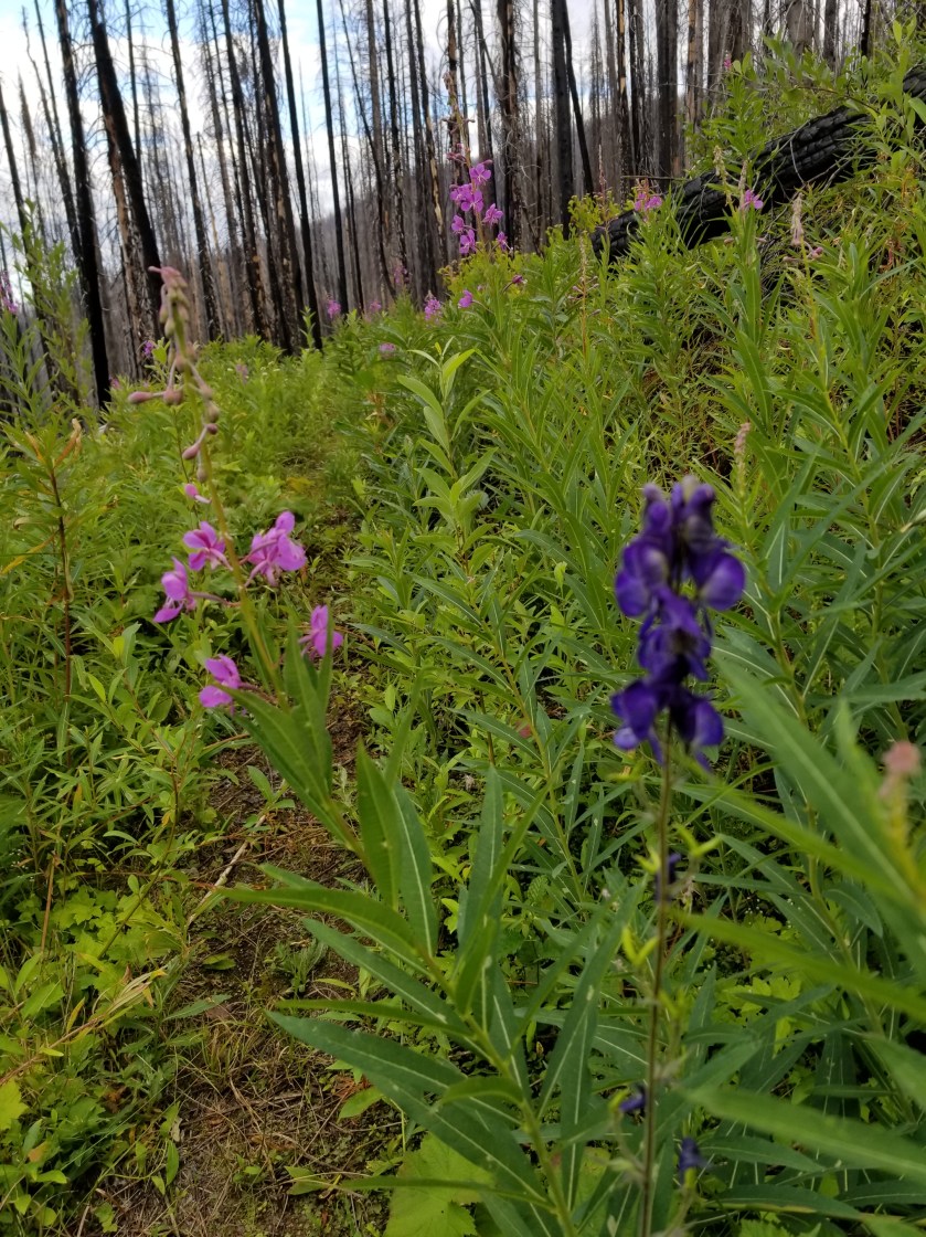 It is such a contrast between the massive carnage of a forest fire and the rapid evolution of plants scrambling to seize the open terrain. Lupine has an explosive takeover strategy. It develops seed pods that twist and then pop open, scattering seeds. The most interesting thing to me was the absence of pine, spruce, and larch seedlings. They must bide their time and rely on their height genetics to overcome the early lead of other plants.