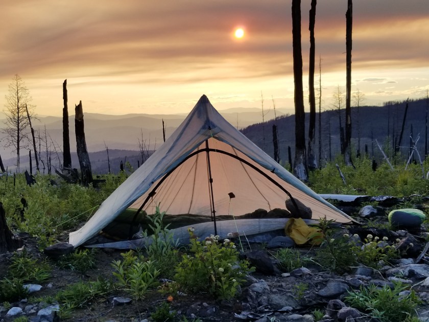 Eventually, I reached the saddle I was shooting for. There was about 45 minutes before sunset. An odd cloud of smoke hung in the air. Plus, for once, it was windy. So, I made camp quickly, avoiding standing dead trees. I pointed the open end of my tent away from the wind. I had to put on my wool hoody plus my down puffy.